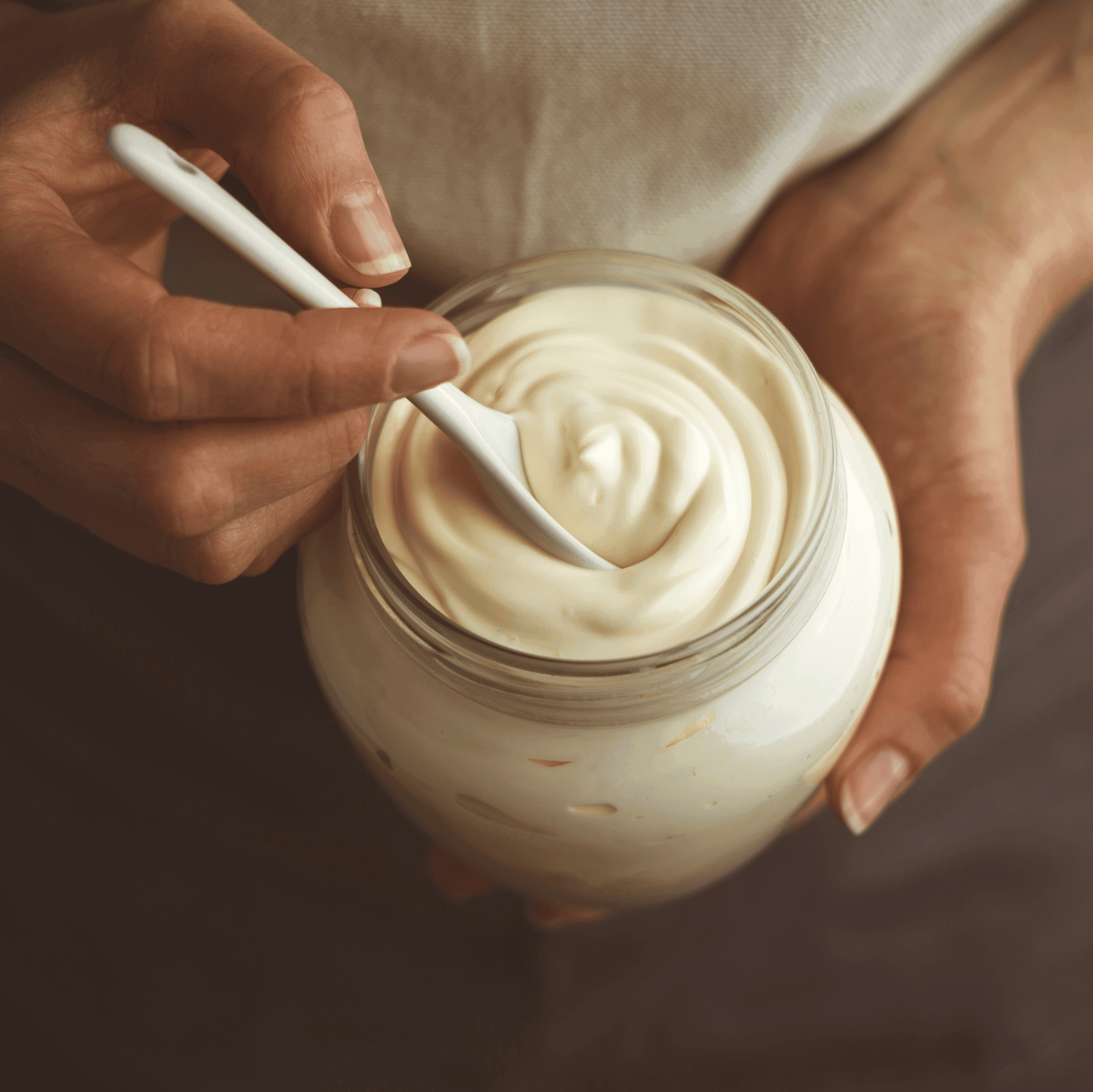 Deze mayonaise op basis van eidooiers en boter is heerlijk romig en vol van smaak. Ingrediënten: 1 ei (op kamertemperatuur) 250 gram roomboter, gesmolten en afgekoeld...